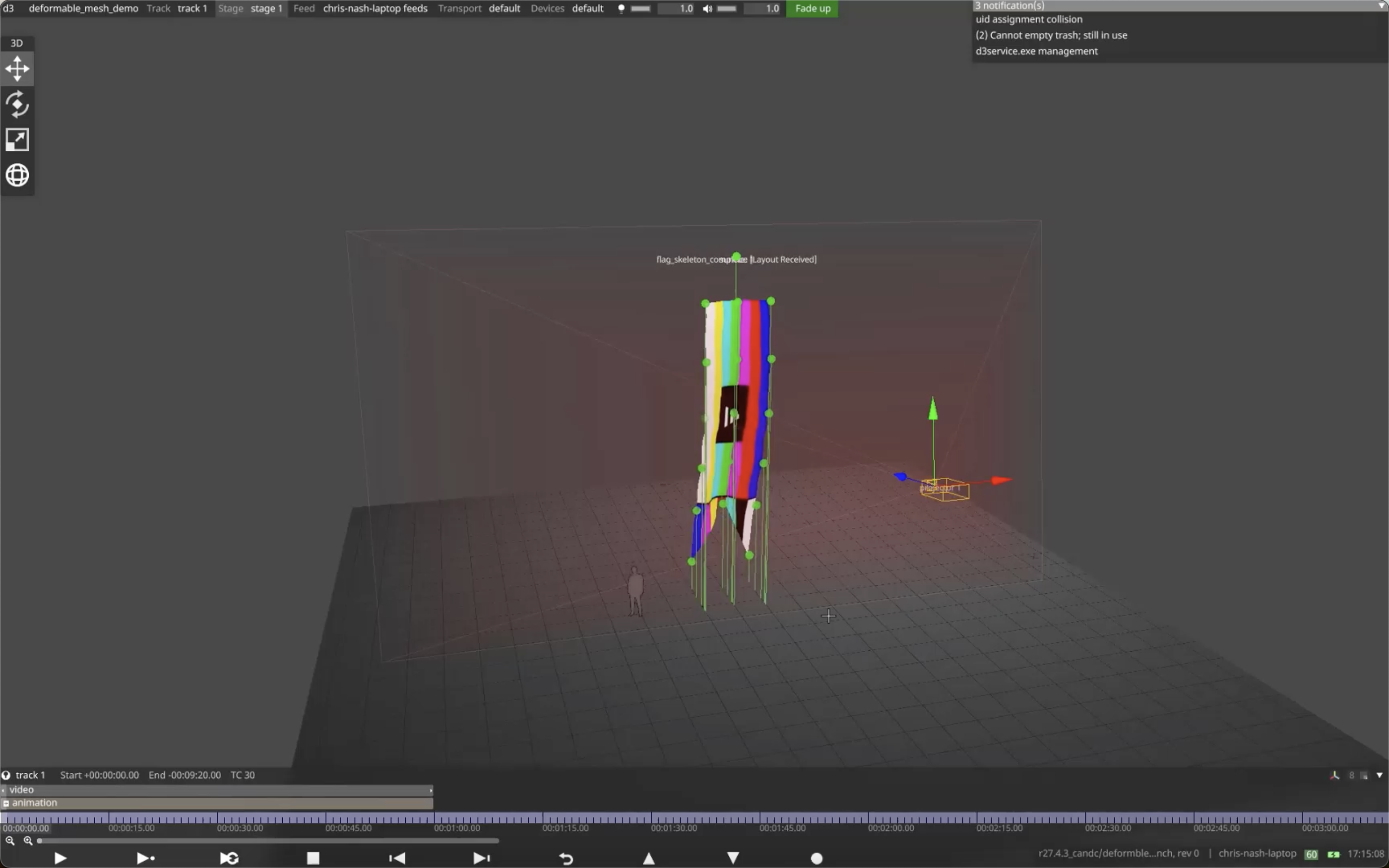 As the skeleton moves, the mesh deforms accordingly, reflecting the natural motion of the fabric. This allows for more realistic and intricate projections on moving surfaces. It can also improve efficiency in cases with large numbers of moving, rigid screens. Rather than having to create the screens individually in Designer, we can create a skinned mesh to render to them from a single canvas.