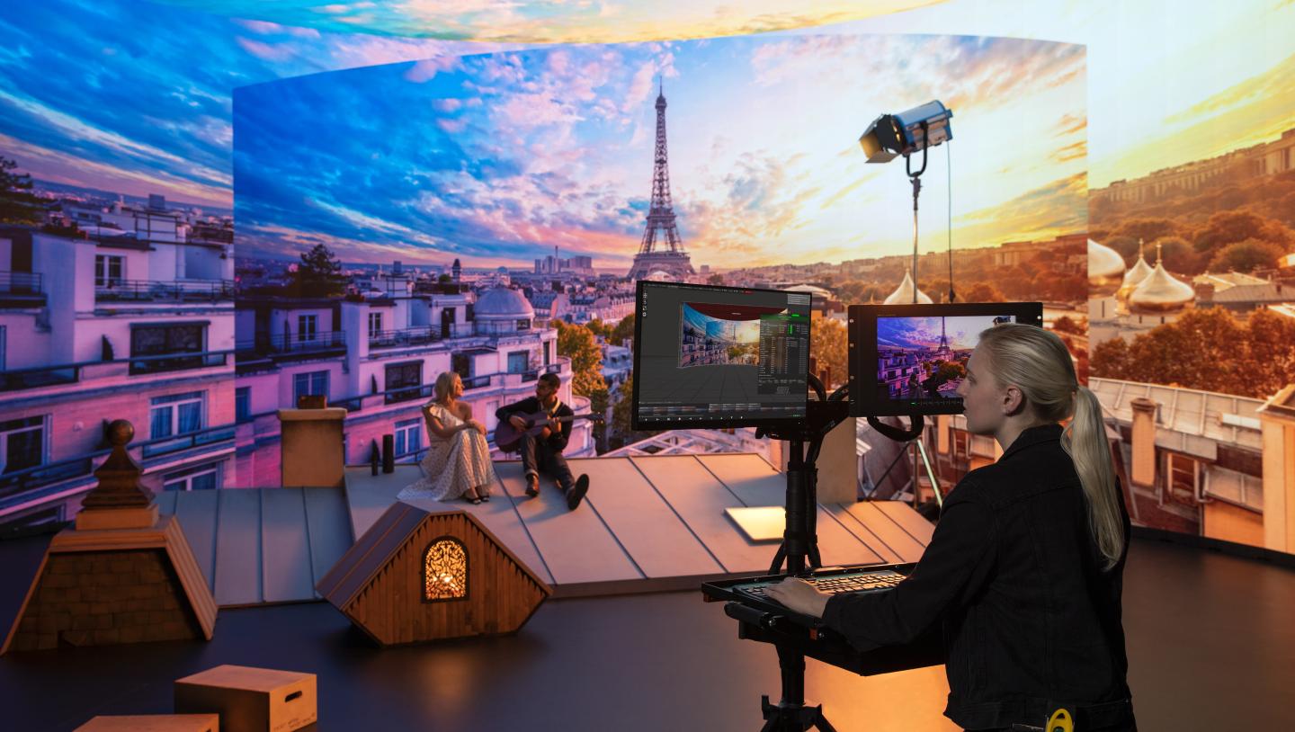 The xR stage is made up of a 60 x 16 ft curved LED wall with a 38 x 20 ft LED ceiling, featuring a stYpe RedSpy camera tracking system. The entire studio is powered by Disguise xR technology, running on Disguise VX 4 and RX II servers.