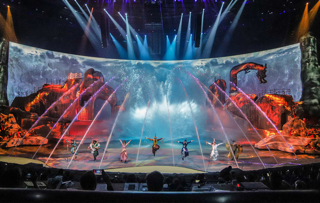 The show is staged in an innovative immersive theatre seating up to 1,500 spectators, featuring two sets of revolving bleachers and a 360º view of the action. The massive 50-metre wide water stage is backed by a beautiful 15-meter-high projection screen. There is also more than 430 items of special equipment, 263 costumes, 2D 3D flying systems and thousands of props are used on set for this unique storytelling show.
